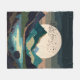 Un paisaje abstracto de una superluna masiva en una escena de un lago montañoso con una bandada de aves en texturas atrevidas y tonos oscuros de tierra de marrón, beige, marrón, azul, cian y negro.