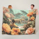 The image presents a surreal scene where a person sits with their back to the viewer, observing a landscape featuring elephants and a zebra standing in water. The scene is framed by an abundance of peach and yellow flowers and lush greenery, creating a dreamlike atmosphere. The background includes trees and a flock of birds in a light blue sky.