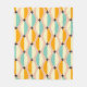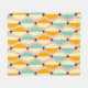 Symmetrical retro pattern with interlocking teal, yellow, and orange shapes on a beige background. Black star-like accents add contrast, creating a vintage feel.