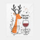 A funny and cheerful Christmas holiday design showcases a reindeer wrapped in festive lights, holding a glass of red wine, surrounded by colorful stars. The handwritten text says, "Tipsy and Bright." This delightful design is available on a variety of products, making it a perfect gift for wine lovers.