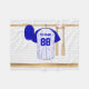 Jersey de béisbol blanco y azul personalizado colgado en un vestuario deportivo con gorra de béisbol, bates de béisbol y bola que es totalmente personalizable con tu propio nombre y número. Un gran regalo para cualquier jugador o aficionado de béisbol, bola en t o softball. Aceptamos solicitudes de personalizados para diferentes combinaciones de colores para los colores de su equipo. Contáctenos a través de nuestra tienda con su solicitud antes de la compra y estaremos encantados de crearla para usted.