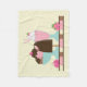 Una manta de lana con un tema de helados dulces. Ilustrado con una barra de helado de chocolate, un sundae de 3 cucharas con una cereza sobre la mesa y un flotador de fresa con crema batida. Fresas y cerezas. Fondo amarillo pálido. Los dulces y calientes dulces del verano.