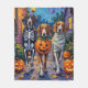 Adorable Treeing Walker Coonhounds vestido con juguetones disfraces de Halloween lleva cubos de calabaza mientras truco o trato bajo el cielo iluminado por la luna. Este diseño festivo resalta el abrigo tricolor de la raza, la postura de alerta y la personalidad aventurera, capturando a la perfección la atmósfera espeluznante y divertida de la noche de Halloween. Una encantadora celebración para los amantes del Treeing Walker Coonhound, entusiastas del perro y fans de Halloween.