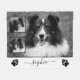 Plantilla de foto mascota personalizada que tiene ranuras para tres fotos personalizados. Hay una foto grande y dos fotos más pequeñas encima de la grande. También hay un área de texto personalizable para un nombre. A cada lado del texto hay siluetas de papel de perro negro.