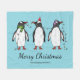 El ilustracion original de Destei de tres pingüinos festivos de Gentoo con coloridas luces Navidades con sus picos. Un pingüino lleva una bufanda verde, otro lleva protección para el oído morado y el tercer pingüino del medio lleva puesto un sombrero de Santa Claus rojo y blanco. El color de fondo es azul claro. También hay dos áreas de texto personalizables.
