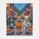 Los adorables Chihuahuas vestidos con juguetones disfraces de Halloween llevan baldes de calabaza mientras truco o truco bajo el cielo iluminado por la luna. Este diseño festivo destaca el pequeño tamaño de la raza, su gran personalidad y su animado espíritu, capturando a la perfección la atmósfera espeluznante y divertida de la noche de Halloween. Una encantadora celebración para los amantes del perro y los fans de Halloween por igual.