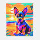 Un cuadro vibrante de un cachorro chihuahua diminuto contemplando la colorida puesta de sol en una playa de arena (Este diseño hecho con IA). ¡Haga el pedido hoy y acepte la alegría de ir de compras!
