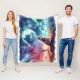 In this surreal twilight dreamscape, a lone wolf sits beneath a leafless tree, bathed in hues of pink, violet, and indigo. Above, a celestial guardian wolf emerges from the glowing moon, its ethereal presence watching over the earthly realm. Stars, nebulae, and multiple moons shimmer across the sky, blurring the boundary between wilderness and cosmos. A distant silhouette hints at unseen companions, evoking themes of spiritual connection, solitude, and cosmic guidance.