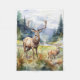 Two deer in mountain landscape with trees and flowers