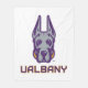 El logo de la mascota de la Universidad de Albany Great Dane muestra una elegante representación de la cabeza de un Gran Danés. El perro está ilustrado con líneas agudas y audaces en morado y gris, dándole una expresión feroz y segura de sí misma. Las orejas se sostienen alto, simbolizando la alerta y la fuerza. Debajo de la cabeza del Gran Danés está la palabra "UAlbany" escrita en letras de oro audaces y bloqueadas, delineadas en morado, reforzando la marca de la universidad. Este diseño representa a los equipos deportivos de la UAlbany, destacando el poder, la lealtad y la determinación.