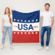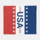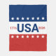 Celebrating the USA's 250th anniversary. This red, white, and blue blanket has the word 'USA' in the center. The years 1776 and 2026 are next to USA. The top stripe is blue and has white stars. The center stripe is white. The bottom stripe is red with white stars.