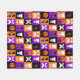Un lindo tablero de ajedrez 100 por ciento original, negro, morado, con calabazas, gatos, fantasmas y cabezas de cráneo cruzadas usando gorras de brujas y sonriendo y guiñando el ojo. ¡Feliz Halloween!