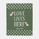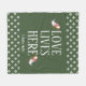 Moderna y elegante "GREEN Fleece Blanket", diseñada con LOVE LIVES AQUÍ en tipografía blanca y referencia de las Escrituras de PERSONALIZABLE que puedes personalizar añadiendo tu nombre (familiar). 1 Juan 4:16 dice: "Dios es amor, y el que permanece enamorado permanece en Dios, y Dios en él". Combinación de colores veraniegos de VERDE y BLANCO, con gráficos opcionales de doble corazón, que puede borrar si lo desea. Manta coincidente y otros colores disponibles.