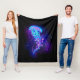 Gran medusa azul, de dibujo artístico, brillante y brillante, con largos tentáculos sobre fondo negro con bioluminiscencia violeta. Luminosas medusas.
