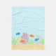 Vida marina con peces naranjas y azules jugando entre arrecifes de coral y algas, en medio de burbujas oceánicas.