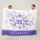 Esta manta de pulpa con temática de voleibol de chica bonito presenta una "explosión" de balones de voleibol de tamaño variado, de balones de voleibol gris y blanco y de estrellas moradas, grises y blancas sobre un fondo negro de personalizable - personalizar con el nombre y número de camiseta del atleta - los paneles de voleibol gris y lilac se mezclan con un patrón kaleidoscópico floral de aspecto de aspecto girado para textura, y diminutas sobrepasa la estrella púrpura - de katz_d_zynes