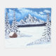 A fleece blanket with a beautiful winter scene including snowy mountains, rustic cabin and evergreens in heavy snow. Original artwork by W.B.