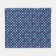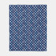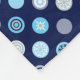 Una manta de fleche de invierno con un patrón de punto de polka de copos de nieve, estrellas, remolinos, puntos y más en tonos azules, grises y blancos sobre un fondo azul oscuro.