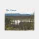 Vistas a la taiga del Yukón. También aparece un texto de personalizable que dice "El Yukón". La taiga, o bosque boreal, cubre vastas partes de la alta latitud norte del norte de Europa a través de Rusia europea y Siberia, a Alaska y Canadá, entre las estepas al sur y la tundra sin árboles más al norte. La taiga se caracteriza por un bosque de coníferas interminable, la tierra pantanosa salpicada de lagos y estanques. El Black Spruce, Picea mariana, son muy comunes y adquiere una forma de columnar cuando crece en terreno húmedo como en este punto de vista desde cerca de Beaver Creek, Territorio Yukón. Durante el verano, los mosquitos pueden ser increíblemente numerosos.