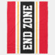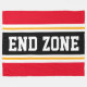 Este diseño deportivo, atlético, presenta texto en negrita END ZONE dentro de una franja negra ancha resaltada con doble franjas de carreras blancas y amarillas contra rayas exteriores brillantes rojas. El texto se puede personalizar.