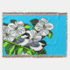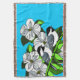 Pechuga negra y arte de flores de madera de perro con contorno negro sobre fondo azul claro