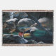 Dos patos de madera en un estanque en el bosque. Árboles y rocas alrededor del estanque, mientras que los patos de madera machos y hembras disfrutan del estanque.