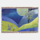Un paisaje abstracto que representa colinas onduladas con un florido árbol primaveral y plantas y una luna y estrellas en tonos azules, cian, amarillo y rosa.