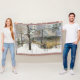 Artista de Zolotareva. acuarela sobre seda - dibujo manual; puente de piedra a través del río en el pueblo. Vista de un puente cubierto de nieve en el bosque.