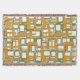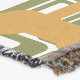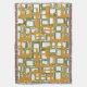 Esta manta de tiro tiene un diseño moderno de mediados de siglo de rectángulos abiertos en oro sobre rectángulos abiertos en verde.