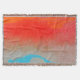 Un diseño abstracto de una puesta de sol del océano con colores llamativos en rojo, naranja, cian, azul y beige.