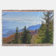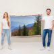 Un paisaje montañoso sereno se caracteriza por unas colinas onduladas adornadas con un follaje otoñal vibrante, lo que crea un tapiz colorido contra los picos distantes cubiertos de niebla. El primer plano está rodeado de árboles de color verde altísimo, lo que añade profundidad a las impresionantes vistas.