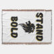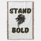 Esta manta de lanzamiento tiene un diseño que muestra las palabras "Stand Bold" en un tipo de letra negrita con letra negra sobre una sombra de color dorado con un ícono de cabeza de león negro y oro en el centro en este tema de cita de la biblia basado en la fe. Esta manta está hecha con 75% de algodón y 25% de poliéster con un toque muy suave de lavado de manos.