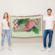 Flamingo rosa con hojas tropicales verdes y azules rosas en un fondo rosa claro