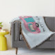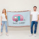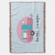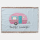 Ilustracion de remolque RV rosa con texto "Happy Camper" sobre fondo azul claro
