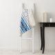Diseño en color blanco con líneas verticales en tonos azules y brocado abstracto.