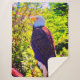 Un majestuoso águila calva está encaramado sobre una rama, con su aguda mirada dirigida a un lado. Su cabeza blanca y su cola contrastan notablemente con el cuerpo marrón oscuro y las alas con un fondo de vegetación exuberante.