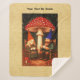 Escena rústica con una pareja monótona sentada tomando té bajo un hongo azárico rojo y blanco (Amanita muscaria) en un bosque de roble oscuro. Todo está superpuesto en una imagen de fondo de papel antigua. Personalizar agregando su propio texto.