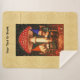 Escena rústica con una pareja monótona sentada tomando té bajo un hongo azárico rojo y blanco (Amanita muscaria) en un bosque de roble oscuro. Todo está superpuesto en una imagen de fondo de papel antigua. Personalizar agregando su propio texto.