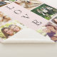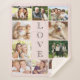 Una manta sherpa de collage de fotos rosas que incluye 10 fotos familiares y "LOVE" escrito verticalmente en el medio en tipografía abierta.