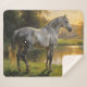 Andalusian Stallion by the Lake showcases a regal silver-gray horse standing at the water’s edge during a golden, late-day glow. The soft light reflects across the lake and highlights the stallion’s strong frame and graceful posture. The surrounding landscape—lush grass, calm water, and warm sunset tones—adds a peaceful, classical feel to the artwork. It’s a serene moment that captures both strength and quiet beauty.