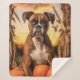 Disfrute de lo último en confort y compañía con nuestra cálida y acogedora manta con un perro Boxer en medio de un campo de calabazas al atardecer. Es la invitación perfecta para que te reúnas con tu amigo y crees recuerdos preciosos juntos.