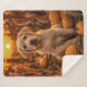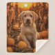 Experimente lo último en comodidad y compañía con nuestra cálida y acogedora manta con un adorable cachorro de Labrador Amarillo en medio de un campo de calabazas al atardecer. Es la invitación perfecta para que te reúnas con tu amigo y crees recuerdos preciosos juntos.