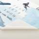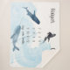 Minimalista manta de hito para bebés de temática oceánica neutra para mellizos con tres ballenas diferentes y olas de acuarela abstractas.