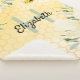 Un fondo dorado con un patrón de abejas y abejas sonrientes felices. Decorada con flores de Hibiscus tropical de color amarillo claro y crema, flores. Añade tu nombre y letra de monograma, letras verdes y negras. El nombre se escribe con un guión de estilo con letras a mano.