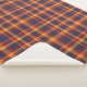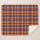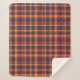 Rústica casa de campo caída manta de lana de sherpa plaid en tonos de naranja quemado, azul oscuro, rojos y amarillo.