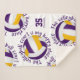 Esta bonita manta de gafas de voleibol con temática sherpa cuenta con 5 bolas de voleibol púrpura, doradas y blancas con el texto: "La cancha de voleibol es mi lugar feliz" en morado rodeando cada voleibol con una divertida fuente tipográfica, todo sobre un fondo blanco - su nombre y número de camiseta son personalizable - por katz_d_zynes