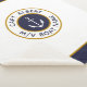 Capitán personalizado con su nombre y nombre de barco logotipo de anclaje náutico sherpa manta. emblema circular clásico con ancla y campos de texto en azul marino, blanco y dorado sobre fondo blanco.