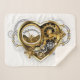 Corazón mecánico, volumétrico, de vapor punk con manómetro de presión, acero y engranajes dorados sobre fondo blanco. Estilo Steampunk.