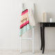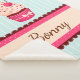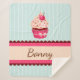 Manta de muñecas con quequitos rosados sobre fondo de rayas azules de menta.