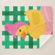 Un encantador pato de goma envuelto en un turbante de toalla rosa se sienta sobre toallas suaves y acogedoras. El vibrante entorno verde de gingham aporta un contraste divertido a los cálidos tonos pastel. ¡Ideal para añadir un toque de luminosidad y relajación a cualquier espacio!
